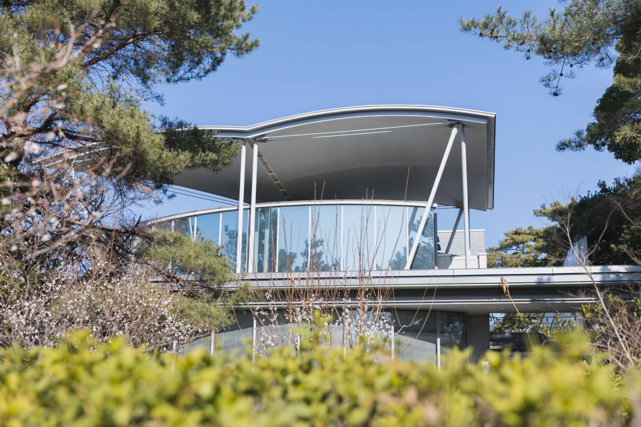 戦後様々な文化・体育施設が開かれ、市民の余暇活動の充実に貢献するなかで、茅ヶ崎市は、郷土に関連する優れた美術品を収集、保存、展示を行うとともに、市民の創作および発表活動を支援する施設として茅ヶ崎市美術館を設立。1998(平成10)年4月に開館しました。 美術館が位置する高砂緑地には、オッペケペー節で知られる近代演劇開祖の一人、川上音二郎とその妻で日本人初の舞台女優となった貞奴が暮らし、その後、日本化薬株式会社を率いた実業家であり、浮世絵版画の大コレクターである原安三郎の南欧風の瀟洒な別荘がありました。小高い丘でもある高砂緑地の裾野には、日本庭園と本格的な茶室を持つ「松籟庵」があります。古き良き湘南の名残を留める美しい松林からは、「松籟」の語源の一つである吹きすぎる風の音が今日も聞こえています。